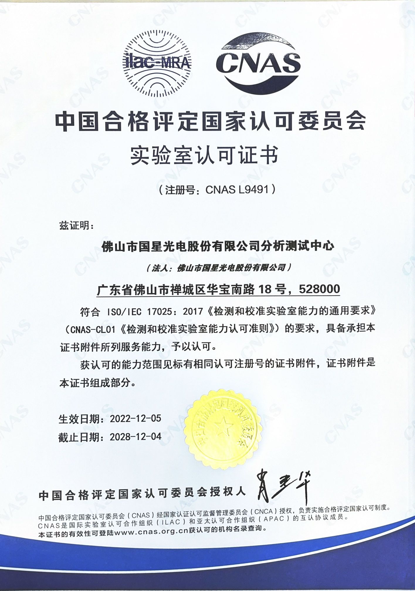 基于公司已通过CNAS换证复评审,目前CNAS系统同步公告开云online(中国)光电分析测试中心认可的检测能力范围。分析测试中心符合ISO/IEC 17025以及CNAS特定要求,维持LED器件、组件及照明产品的环境试验、光电性能检测项目等能力范围,保证可靠、权威的检测能力。
