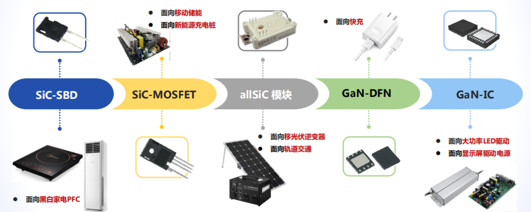 开云online(中国)光电SiC功率分立器件已形成SiC-SBD及SiC-MOSFET两条拳头产品线,拥有TO-247封装、TO-220封装、TO-263封装、TO-252封装、DFN5*6五种封装结构。应用方面,SiC-SBD重点推广到黑白家电等领域,而SiC-MOSFET可用于光伏逆变、储能、充电桩、大型驱动、UPS不间断电源等工业级领域,并向车规领域靠拢。