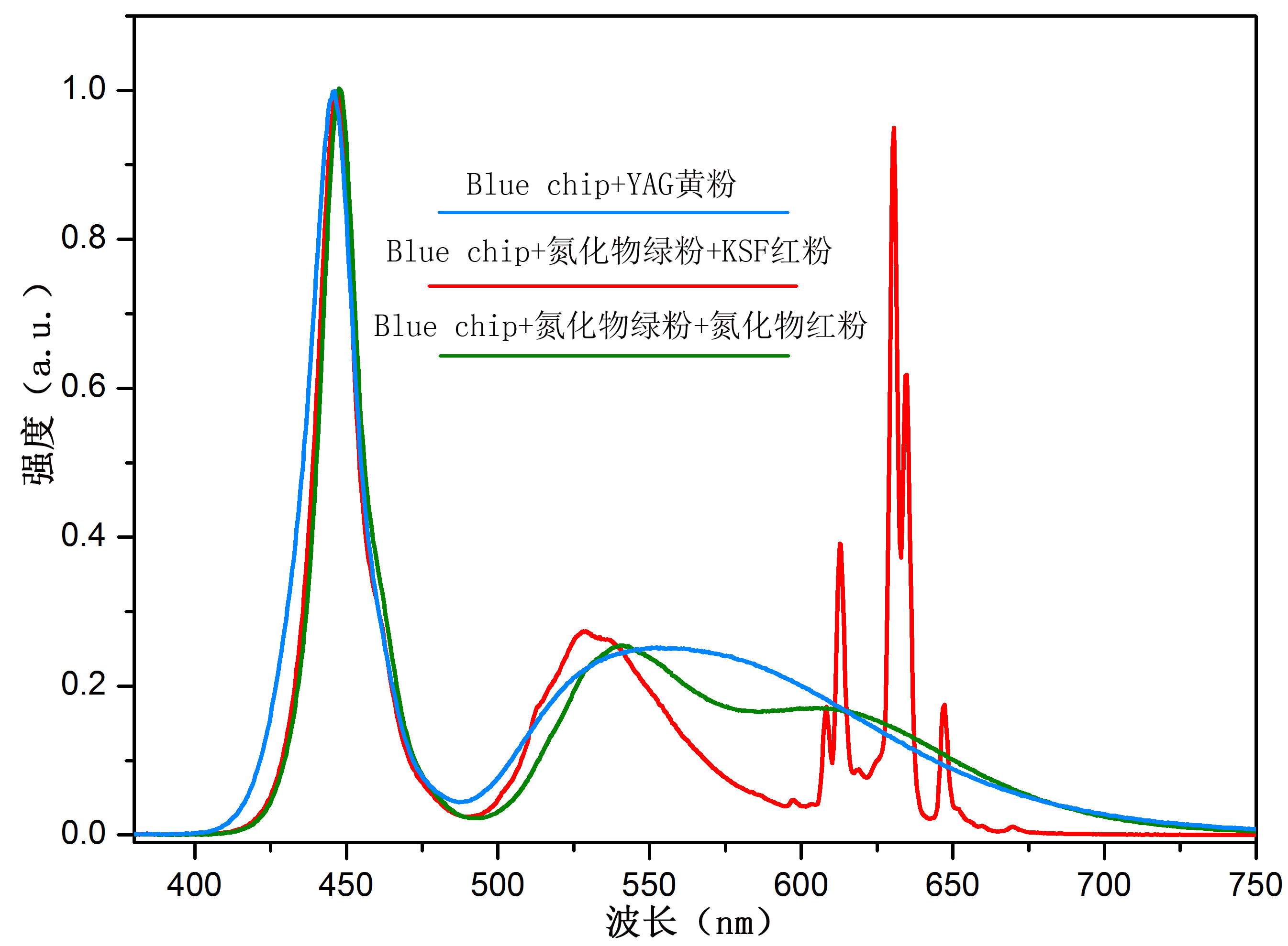 窄半波宽KSF红粉与氮化物荧光粉的光谱对比图