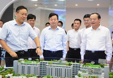袁宝成副省长(右一)在朱伟市长(中)的陪同下参观公司展厅