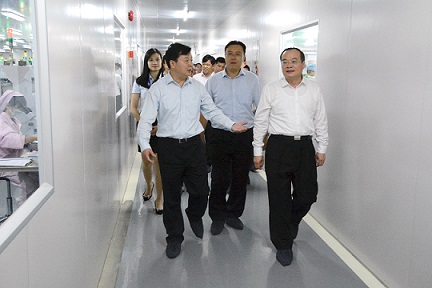 袁宝成副省长(右)在朱伟市长(左)的陪同下参观公司车间