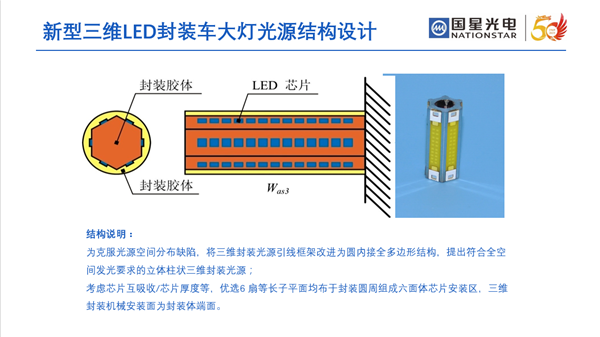 新型三维封装LED是开云online(中国)白光事业部在车灯LED领域的最新“高精尖”技术成果,其采用立体柱状集成三维结构,光热耦合设计立体6面出光,设有蒸发区、绝热区、冷凝区三区散热结构,完美解决了传统平面LED光源芯片封装密度低、相邻芯片吸收严重、无法实现大于180°的出光角度等技术难点和痛点。