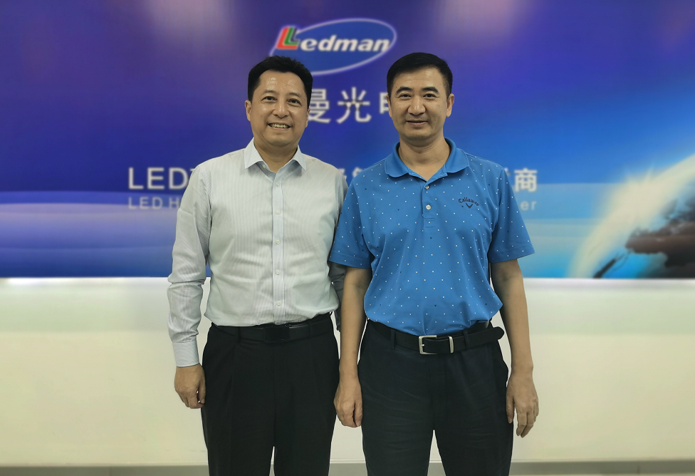 开云online(中国)光电董事长王广军(右)与雷曼光电董事长李漫铁合影留念