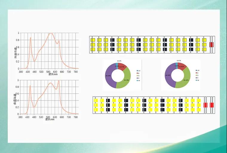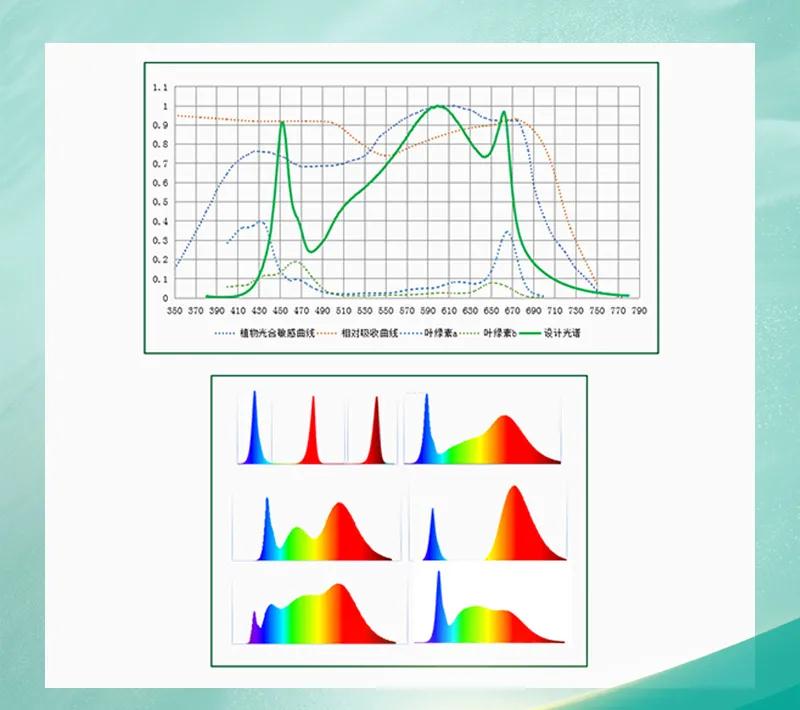 具有丰富的光谱方案数据库,可根据不同植物需求,定制光谱;同时可通过封装工艺设计实现不同角度,设计不同灯具需求的角度,提高单位面积的PPFD。