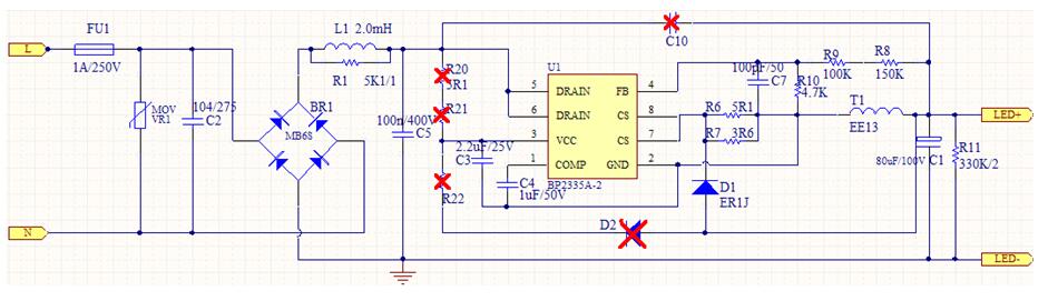BP2335是一款带有PFC的高精度降压型LED恒流控制器,具有有源功率因数校正电路,可以实现很高的功率因数和很低的总谐波失真,内置功率MOS管,工作在电感电流临界连续模式(BCM),开关损耗小,电源效率高,下图是电源原理图。