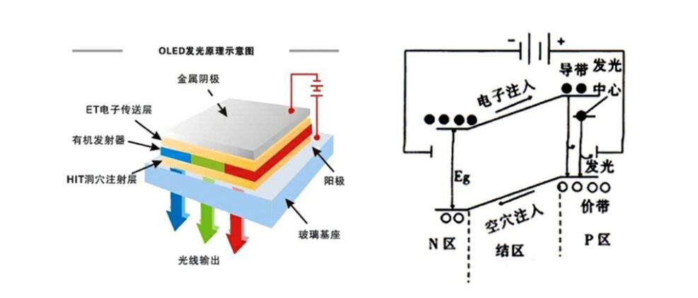 LED主要由带PN结构的固体半导体(芯片)、电极和光学系统组成。外部电源给P/N结两端加以正向电压,使电流从P区流入N区,N区不断注入电子,P区则不断注入正电荷,当电子和电荷的能量达到一定值时,P/N结处的电子与电荷便产生跨越,此时,电子与空穴相结合,在结合的过程中产生大量的能量,而这些能量以光的形式释放出来,即为LED发光原理。