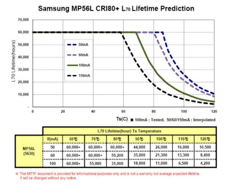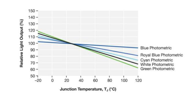 LED芯片的实际工作结点温度越高,超出芯片的最大工作结温时,寿命将急速下降。