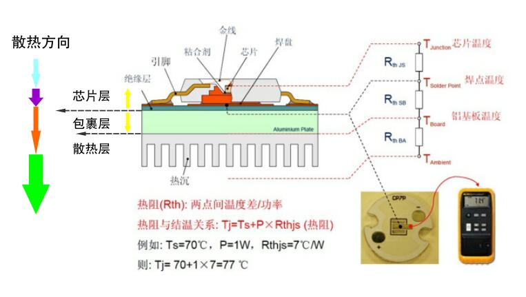 热阻是反映导热材料热量传递能力的综合参量。单位℃/ W,即物体持续传热功率为1W时,导热路径两端的温差。不同材料,导热能力有所差异,每种材料都有它自身的导热系数,导热系数越高,导热能力就越强。LED的总热阻是芯片内外各层的热阻之和。总热阻除了与各层的导热系数有关外,还取决于各层间结合的紧密程度。如果层与层之间结合得不够紧密的话,热传导就会受阻。