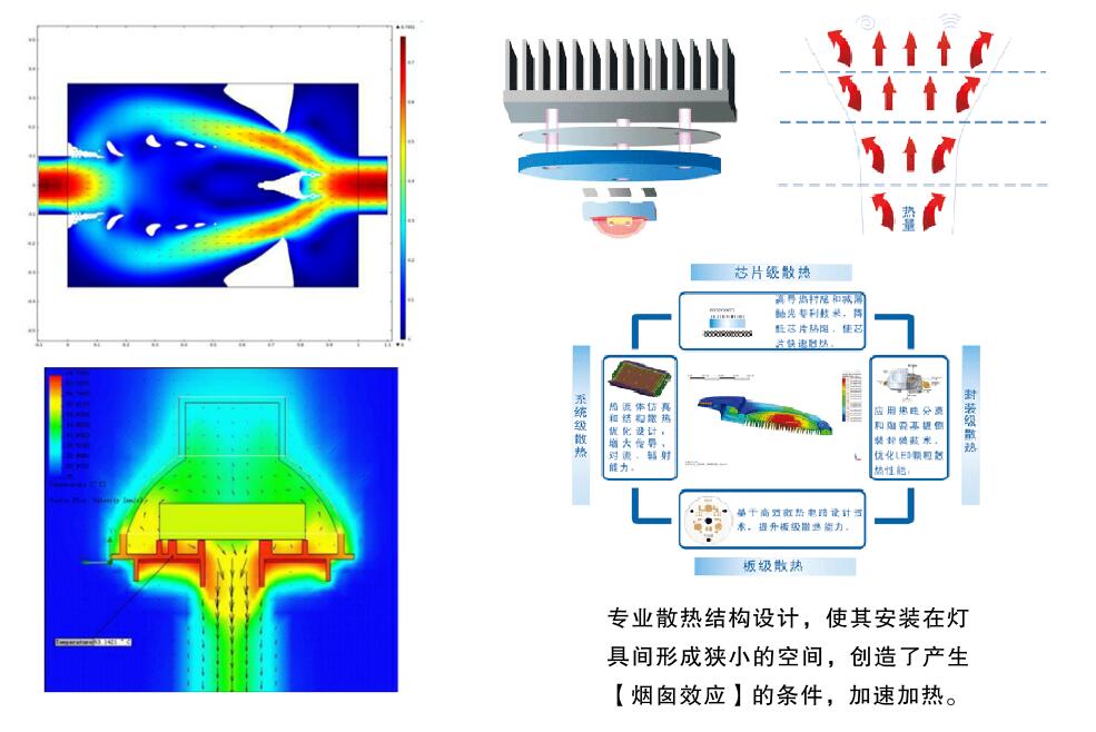 LED照明产品的散热器件通过合理科学的结构设计,运用对流换热的原理,可加速LED光源的散热。对流换热就是利用“烟囱效应”的热空气对流原理,加速LED光源产品的散热,降低LED光源的工作温度,实践证明,采用该技术的LED光源工作性能更加稳定。