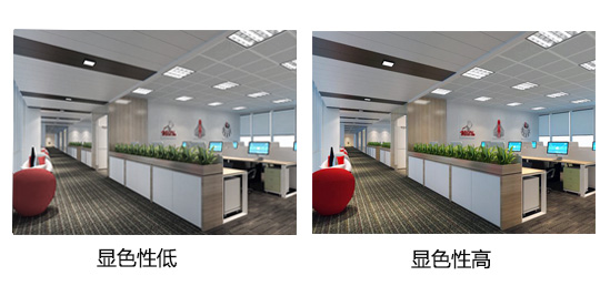 显色性是灯具的基本参数,反映的是照明光源(灯具)对物体(办公环境)色彩还原程度,而显色指数就是评价光源显色性的重要方法,通常以百分比的形式表示,显色指数越高,色彩还原度越高,显色指数越低,色彩还原度越低。