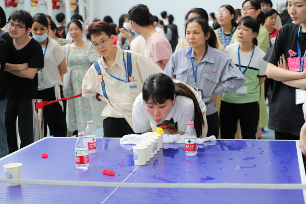 参赛者们弯下身子,深吸一口气,裁判按下秒表的同时,一颗颗乒乓球在参赛者的吹气下,轻轻跃起掉入水杯中。在紧张的气氛下,观众们也屏息凝神地关注着每一颗乒乓球的动向,为掉落的球暗自可惜,为成功的球鼓掌喝彩。