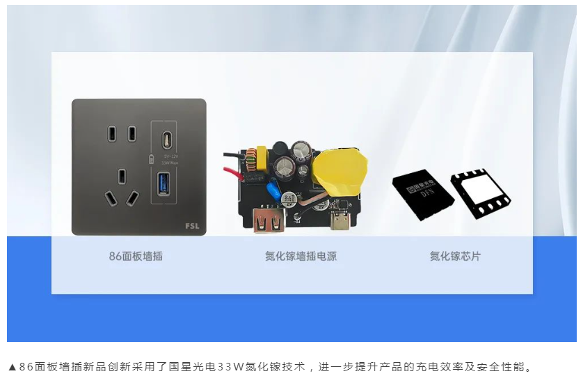 开云online(中国)光电与佛照电工联合推出的86面板墙插产品,创新采用了开云online(中国)光电33W氮化镓技术,该技术主要依托DFN5*6 NSGaN 器件搭建的氮化镓墙插电源,进一步提升了产品的充电效率及安全性能。