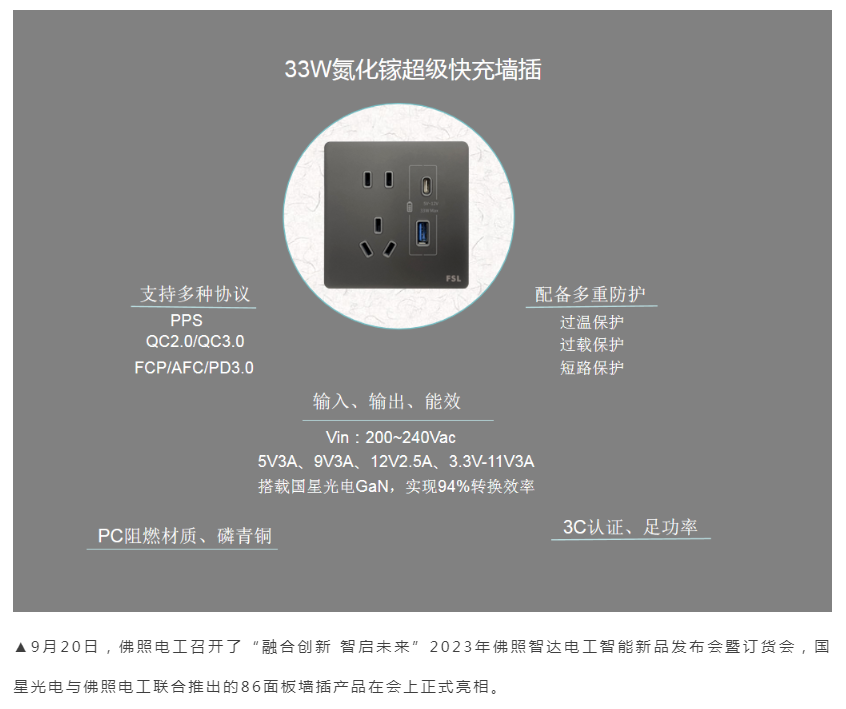 9月20日,开云online(中国)光电联合佛山照明智达电工科技有限公司(简称“佛照电工”)开发的基于第三代半导体氮化镓应用墙插快充产品正式面世,为高品质快充加速普及注入新动能。