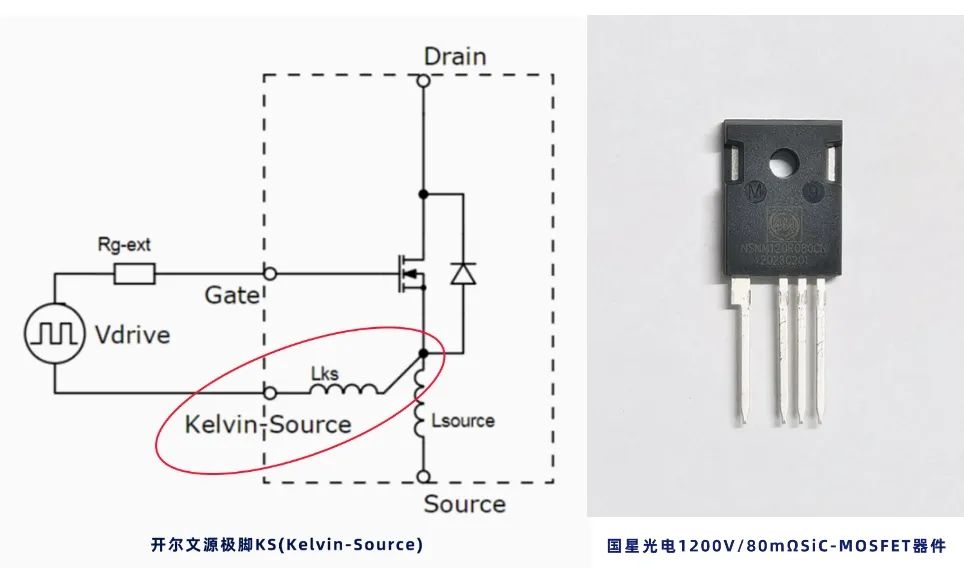 ▲以TO-247-4L为封装形式的NSiC-KS系列产品,产品的封装形式上增加了一个S极管脚,其可称为辅助源极或者开尔文源极脚KS(Kelvin-Source)