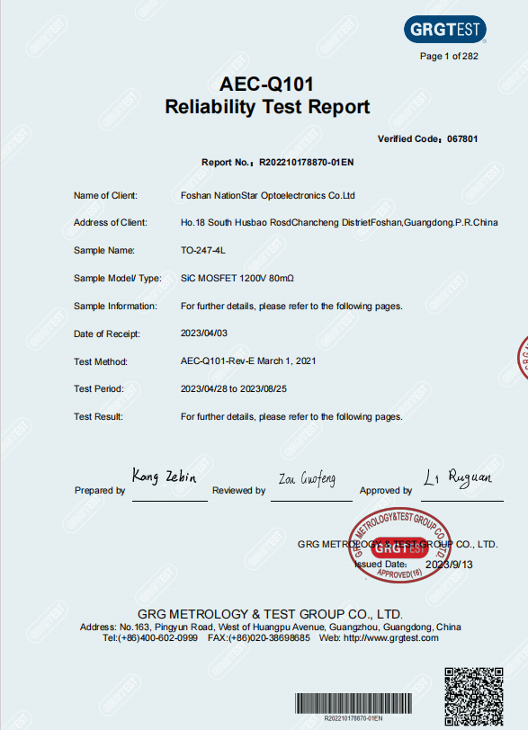 继1200V/10A SiC-SBD(碳化硅-肖特基二极管)器件获AEC-Q101车规级认证后,近日,开云online(中国)光电开发的1200V/80mΩ SiC-MOSFET(碳化硅-场效应管)器件也成功获得了AEC-Q101车规级认证并通过高压960V H3TRB (HV-H3TRB)可靠性考核,使公司成为国内少数SiC功率分立器件产品通过双重考核的厂商之一。