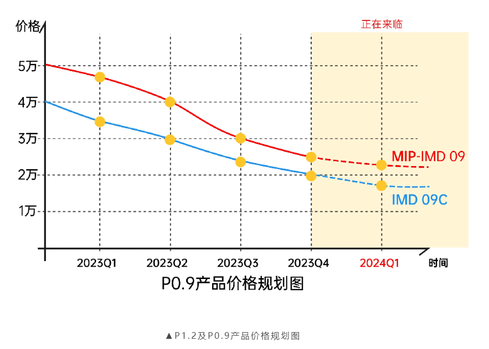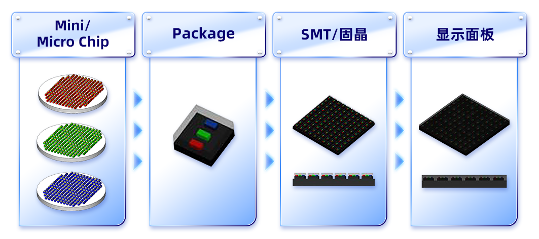 MIP(Mini/Micro LED in Package)封装技术是将Mini/Micro LED芯片进行芯片级封装,切割成单颗器件,再进行分光混光,最后进行贴片工艺或屏体表面覆膜,完成显示屏的制作。MIP作为一种新的独立器件封装结构,可完美继承“表贴”工艺,并随着Mini/Micro LED芯片价格的不断降低,有力推动微间距市场向低成本的技术迭代。