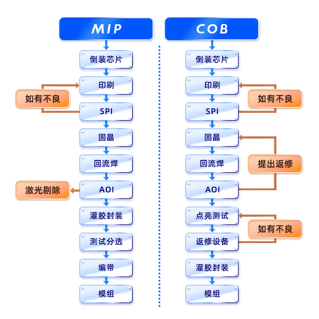 3.MIP和SMD一脉相承,能够沿用SMD生产设备,工艺稳定,设备变量小,无须重资产投入;COB则需单独投资生产线,要求较大的资本投资,且工艺变化大,容易造成设备投资浪费。