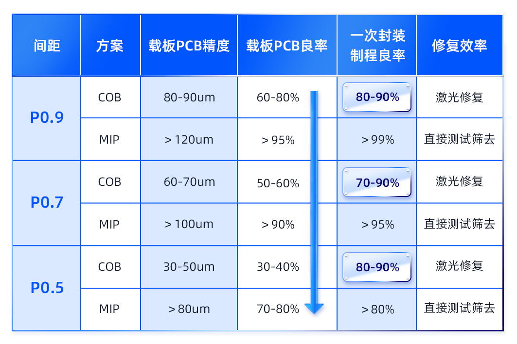 1.MIP扇出封装架构通过“放大”引脚,载板精度要求比COB低,载板生产良率更高;相比COB直接将芯片贴装在线路板上,MIP降低了模组PCB板制造、贴片难度,工艺难度更低,成本更低。