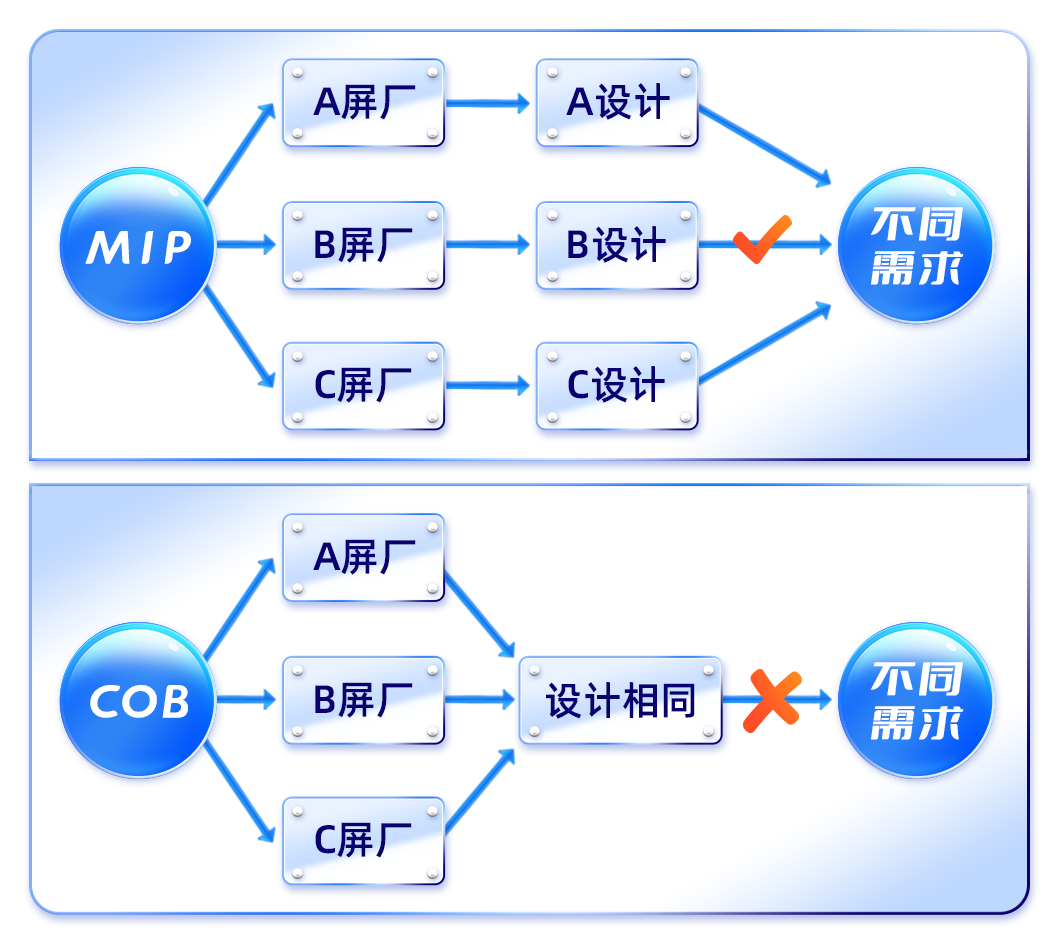5.MIP器件在整个产业链中拥有更好的适配性,应用更加灵活,可根据客户需求制定不同的产品方案,能够兼容当前设备和下游贴装设备,更具产业化优势。