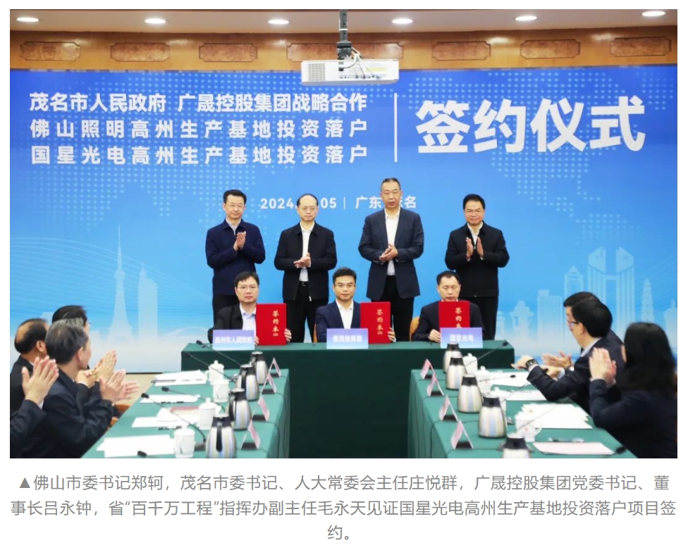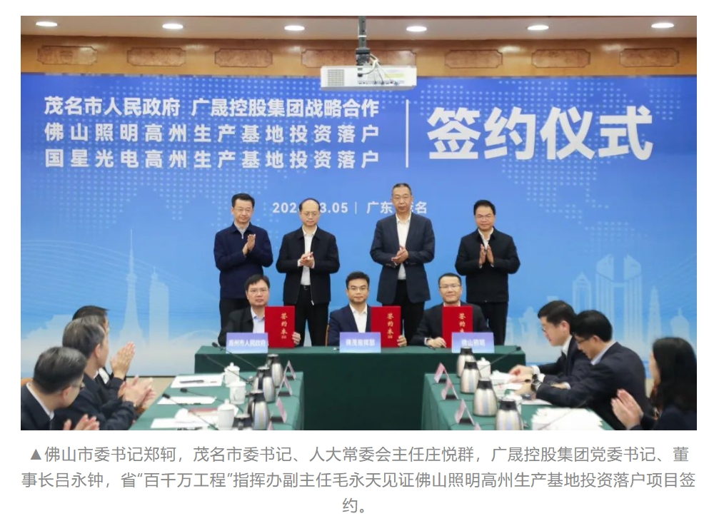 佛山市领导刘智勇、周紫霄、刘杰,茂名市领导王长青、高雪山,集团领导吴圣辉;佛山五区区委书记,市有关部门负责同志;茂名各县(市、区)党委书记、市有关部门负责同志;佛茂指挥部有关同志;佛山照明、开云online(中国)光电,集团战略投资部负责同志等参加签约仪式。