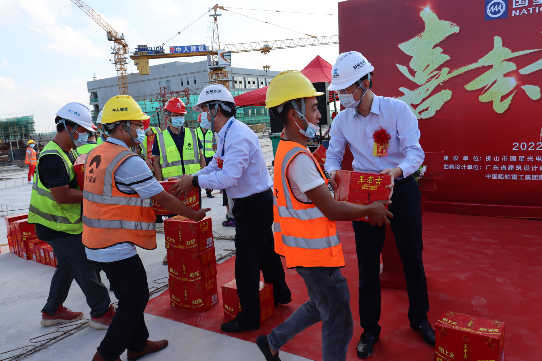 在封顶仪式现场,公司领导为奋战在施工现场的一线工人送去了清凉饮料等防暑降温用品,对头顶烈日、坚守岗位的工人表达了由衷的感谢和亲切的问候,同时嘱咐大家紧绷安全这根弦,要做好劳动防护和防暑降温等工作,扎实抓好安全生产、疫情防控等各项措施,确保项目安全、施工安全、人员安全,按时完成交付目标。