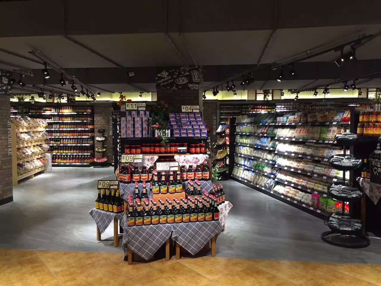 在满足基础照明的前提下,在稍显昏暗的环境下采用轨道射灯对货物进行精准投射,使顾客的目光聚焦到商品上,更突显出商品的诱人本质,从而激发顾客的购买欲。