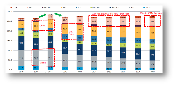 随着技术突破和市场需求,IHS机构数据分析显示,预计2020年全球LCD的产能将突破3.6亿㎡,LCD市场容量巨大,对应的背光市场不可估量。2020年65吋以上大尺寸TV出货量预计超3500万台(含400万台OLED)。