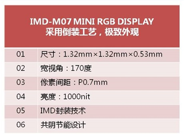 随着产业链上中下游的龙头企业纷纷涉入Mini LED领域,RGB事业部朝向更精细的点间距推进,在2019年6月的美国Infocomm展上正式发布IMD-M07。IMD-M07是LED显示对接液晶点间距的首款产品,代表整个行业在MINI技术上的新突破,也意味着向液晶转化成功迈出第一步。