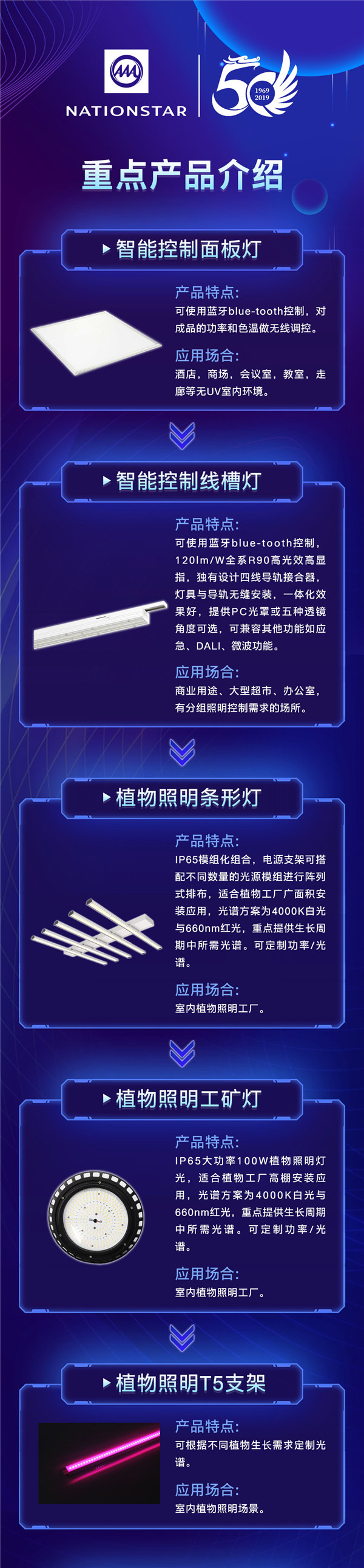针对植物照明应用领域,开云online(中国)光电陆续推出植物照明工矿灯、条形灯、T5支架、三防支架,可根据不同植物生长需求定制光谱,以满足不同植物各种照明场景需求,当前市场上反馈良好,目前已形成批量产出。同时,开云online(中国)光电积极布局智能照明领域,加大智能产品研发投入,导入智能控制系统,实现蓝牙智能控制。目前已推出智能控制面板灯、线槽灯、可调色温吸顶灯等照明产品,为消费者提供全新的智能照明体验。